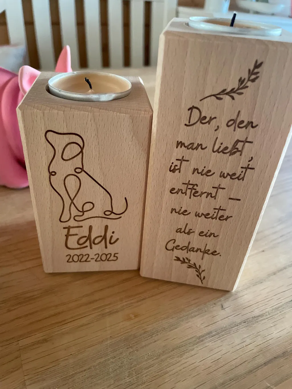 Jeder Teelichthalter ist mit einer individuellen Gravur versehen - Du hast die Möglichkeit, ein eigenes Zitat, den Namen des Hundes und das Geburts- und Sterbejahr auf die Kerzenhalter gravieren zu lassen.